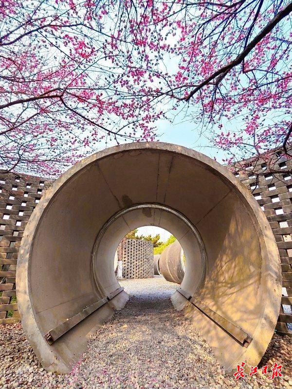记者现场看到,紧邻园路的环形小院院墙,由青砖镂空砌成,墙高3米、内部直径约10米。远远望去,砖墙如同一只精心编织的竹篮,篮内装满红色的梅花,充满东方写意之美。透过砖墙孔洞,可以窥见院内三株梅花依“品”字形栽植,繁花似锦。从水泥管制成的门洞进入,仿佛置身梅屋,头顶梅枝蔽日,院内暗香浮动。