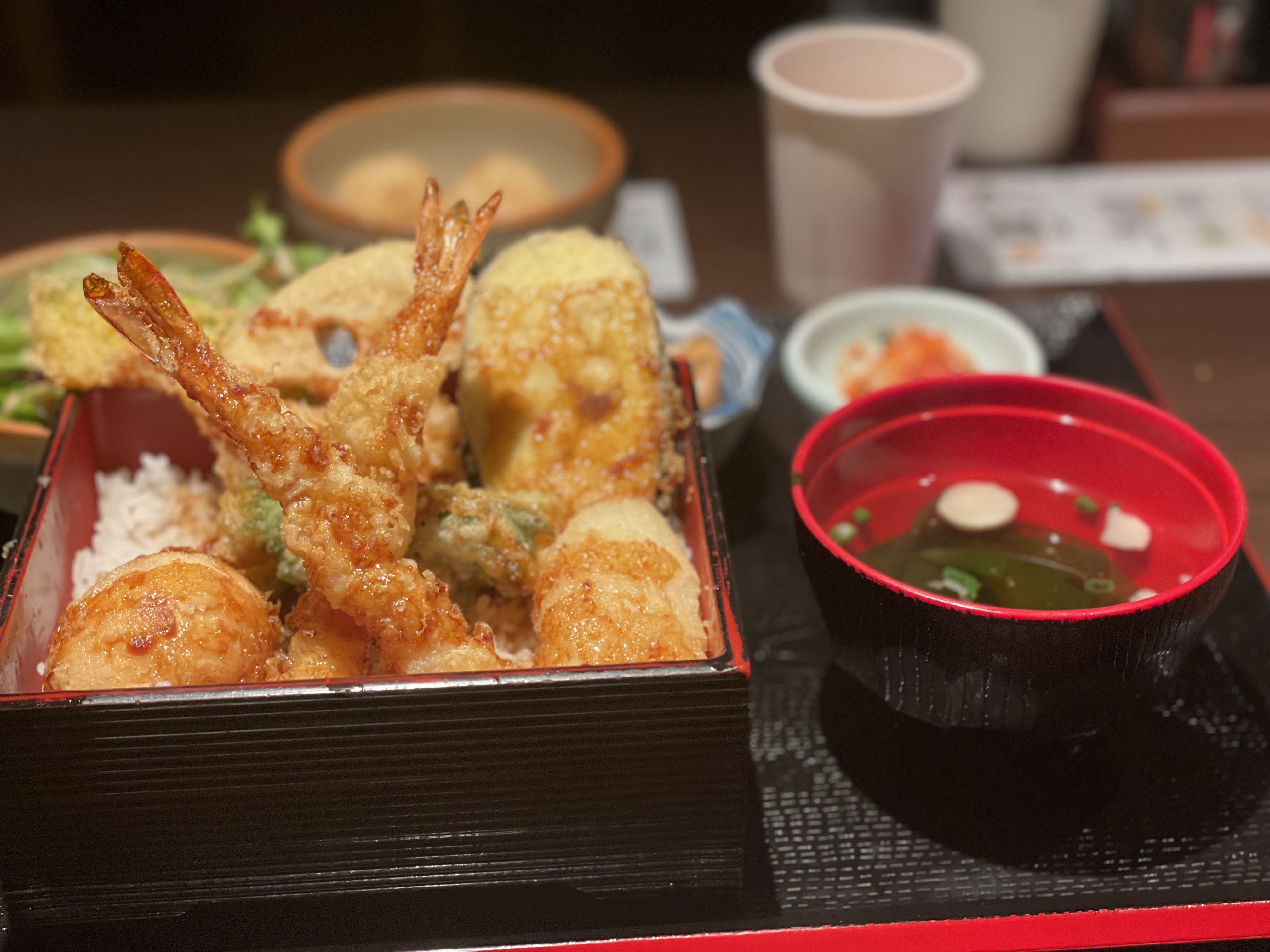 店内价格也较为亲民,招牌天丼、牛肉天妇罗大虾乌冬面、海陆空三个套餐以及两份小食,品相漂亮且分量很足,加起来才不到200元。菜品口味上偏日料清淡,有海鲜有肉有沙拉以及招牌溏心蛋,辣泡菜、米饭、汤可以无限量供应。