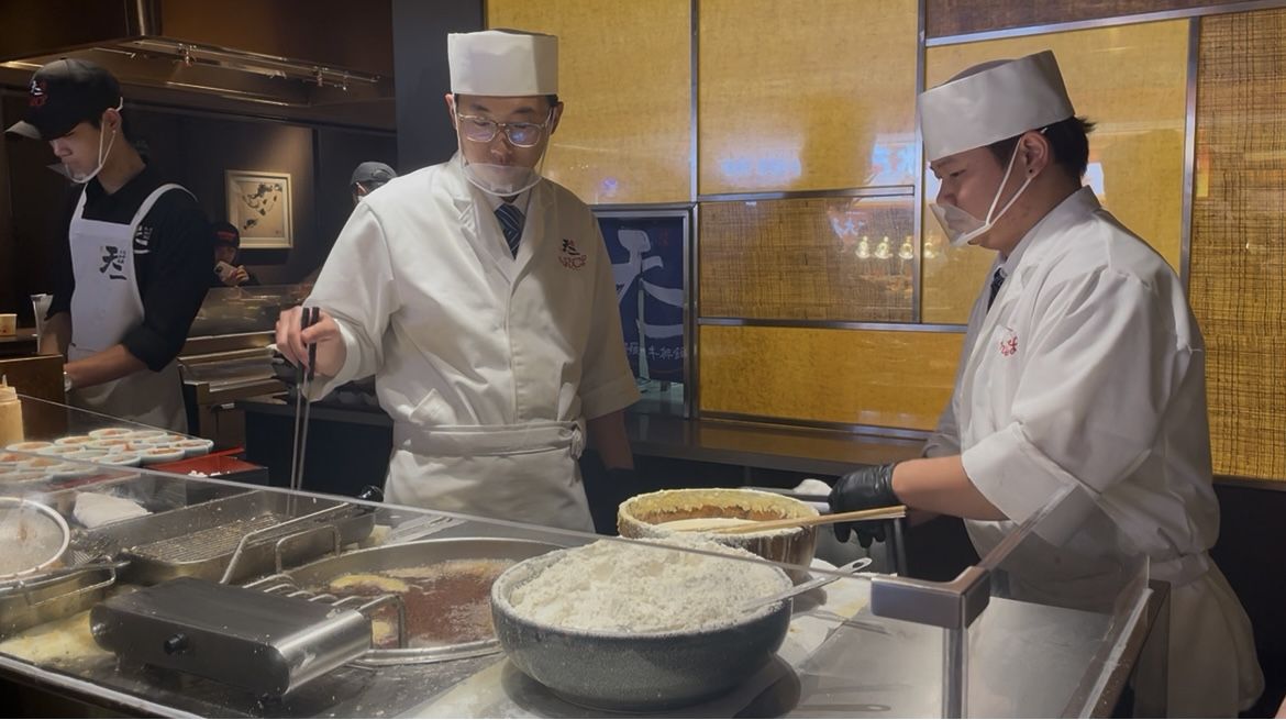 记者看到,店内设置为时下流行的围炉式长桌,厨师在中间操作。为节省活动空间,每个座位下均设有收纳筐放随身物品。这家天妇罗店主打现点现做,所有菜品均在客人面前完成,围绕天妇罗+铁板类产品,推出各种套餐,既有经典天妇罗,也有烟火气十足的铁板牛排等。