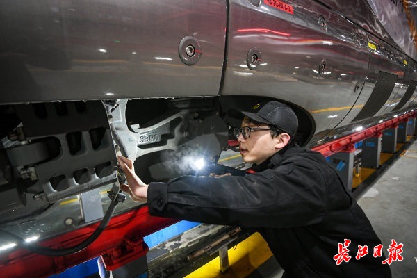 2月1日凌晨2点,城市已沉入梦境,位于武汉东部的中国铁路武汉局集团有限公司武汉动车段运用车间检修库内灯火通明。寒冷的冬夜,这里是一幅热火朝天的景象——一列列白色、银色、金色的钢铁巨龙静卧,头戴安全帽、手持仪器的机械师们俯身于钢铁巨龙之间,为陆续回库的动车组进行严谨而细致的“全方位体检”。