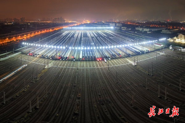 2月1日凌晨1点,武汉动车段灯火通明,近百列高铁动车组整齐排列,蓄势待发,宛如“万箭齐发”。 记者史伟 摄