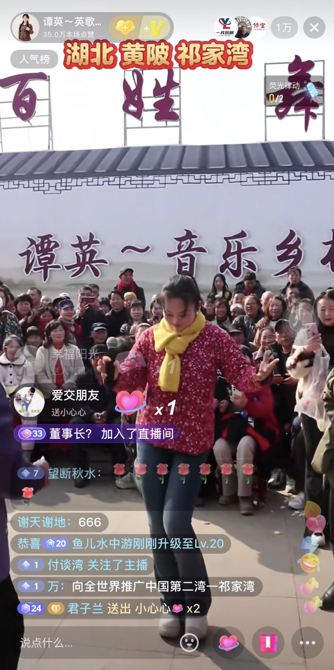 谭英是黄陂祁家湾龙池村付谈湾人,15岁离乡,从跑场演出起步,踏上音乐之路。当天,她身穿红色大棉袄,亲切问候父老乡亲,一首接一首高音歌曲,间隙还不忘与现场观众和线上网友互动。