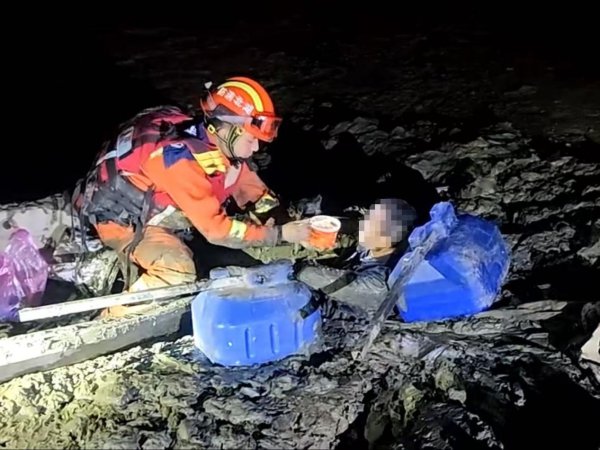 因担心男子体力透支,消防员把男子家属送来食物细心地喂给被困男子食用。