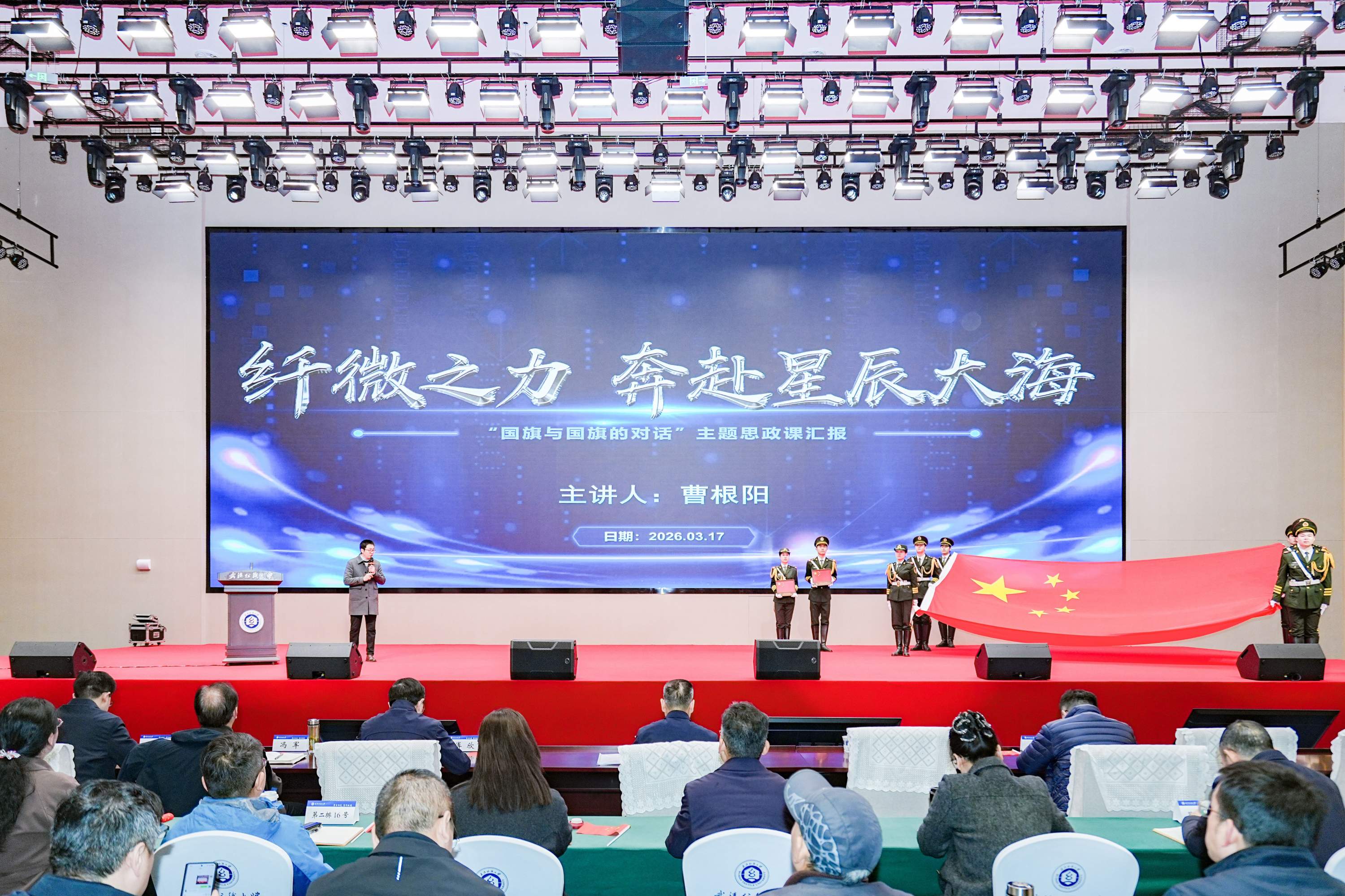 青年教师代表、月面国旗团队核心成员曹根阳为同学们上思政课。讲台上,天安门国旗与月面国旗同框。