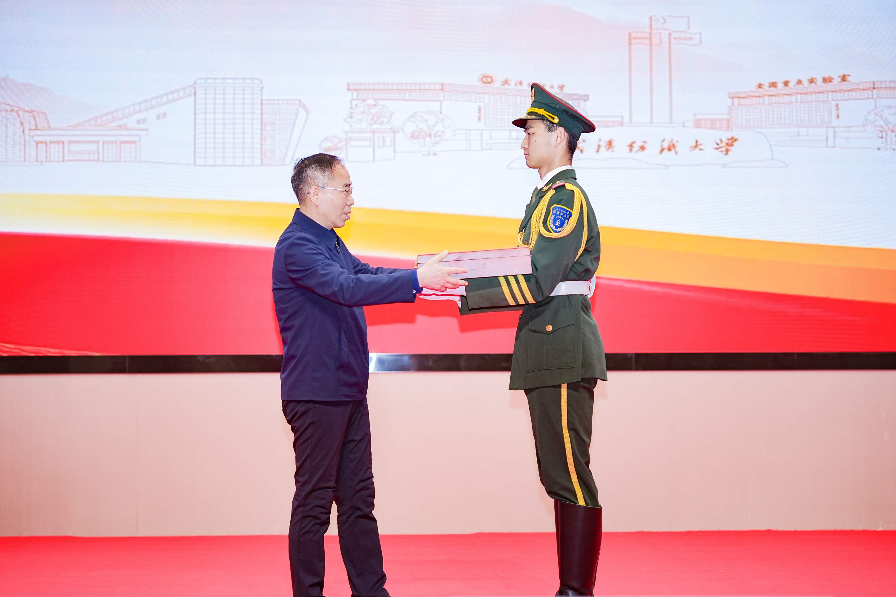 武汉纺织大学党委书记徐卫林将天安门广场赠旗交予校国旗护卫队。
