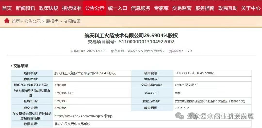 近日,武汉投控集团通过其牵头组建的武汉武创星航创业投资基金,在北京产权交易所成功摘牌受让中国航天三江集团有限公司(以下简称“航天三江”)持有的航天科工火箭技术有限公司(以下简称“科工火箭”)29.5904%股权,成交金额32.9985亿元。这是国内商业航天领域迄今为止最大规模的国有股权交易之一,标志着武汉投控集团在战略性新兴产业布局上取得关键突破,也为武汉打造航天产业新高地注入了强劲的国资动能。
