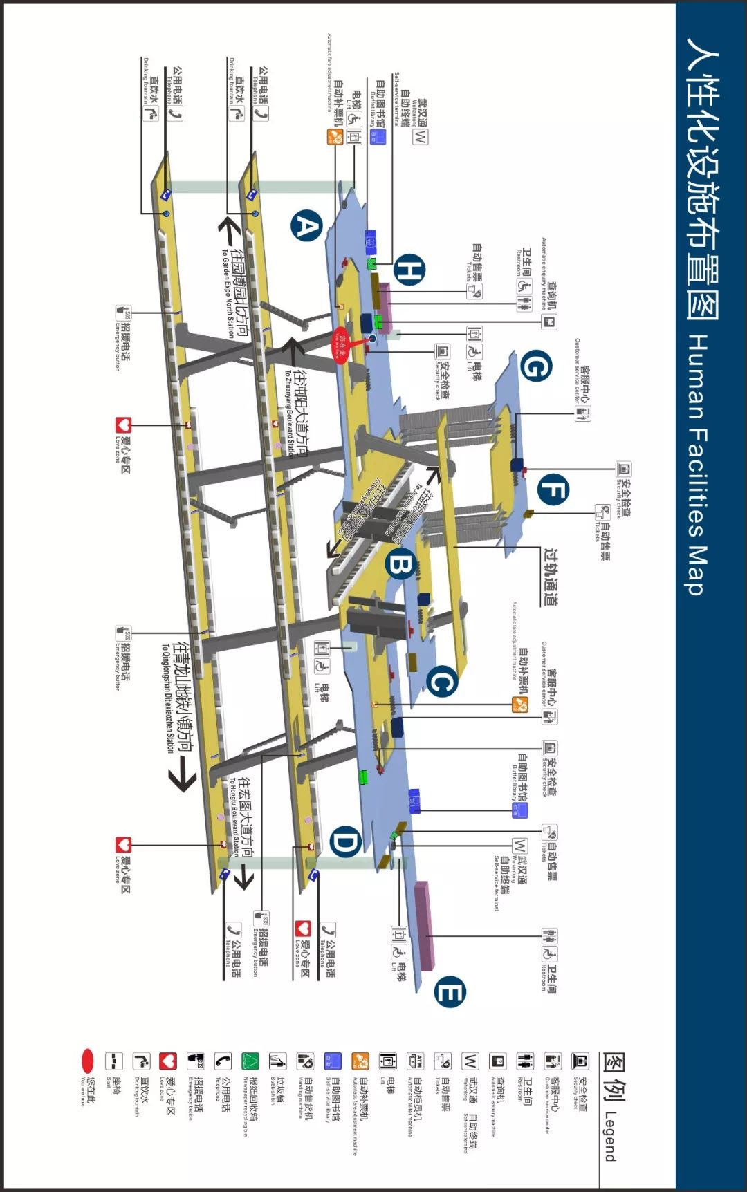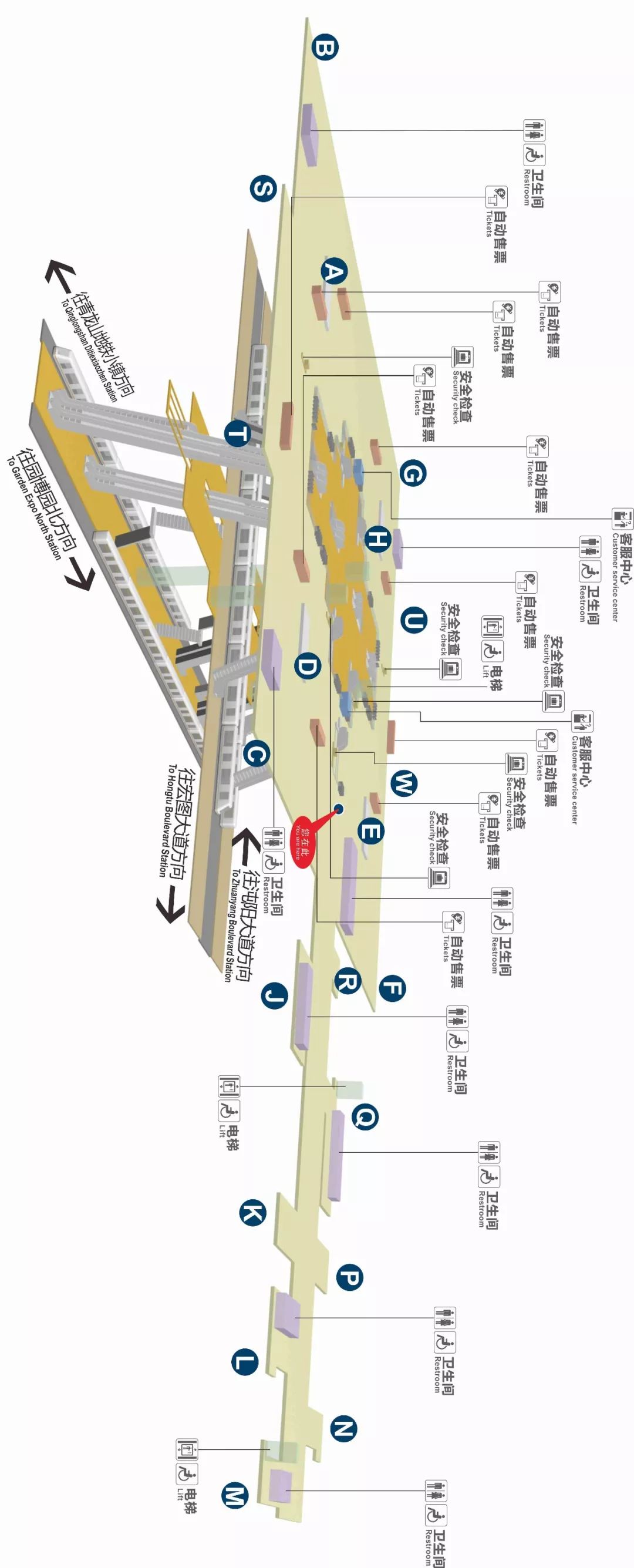“车站内有吊挂、地贴、墙贴、立柱多种指引标识,乘客乘车前一定要看清楚方向。”