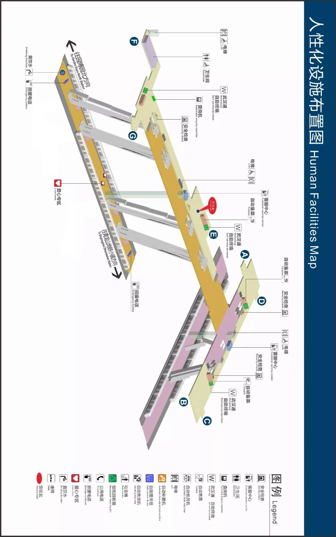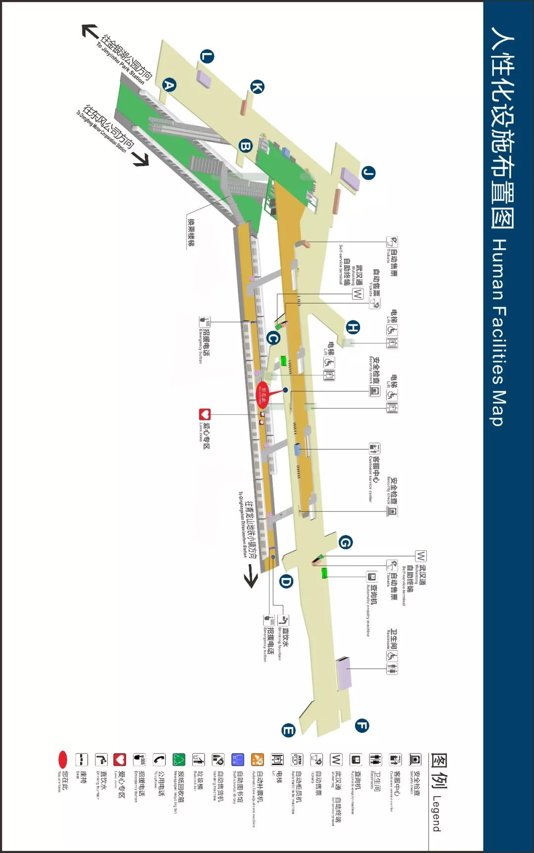武汉商务区站为7号线与3号线换乘站,两条线站台呈“十”字型交错状。
