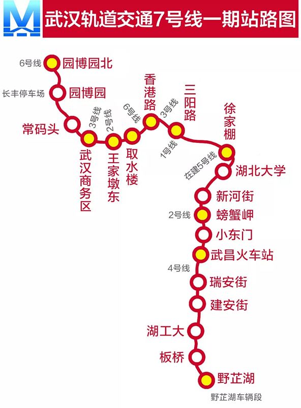 即将开通的轨道交通7号线,目前共有武昌火车站、螃蟹岬、三阳路、香港路、王家墩东、武汉商务区、园博园北7座换乘站,坐上7号线可与1、2、3、4、6号线换乘。