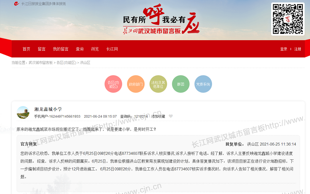 长江日报6月27日讯 东湖外国语学校和街道口小学仁和分校何时建设?大集中学是否会改建?湘龙鑫城小学何时开工?在武汉城市留言板上,多位网友咨询家门口的小学及中学建设问题,相关部门给出了最新答复。