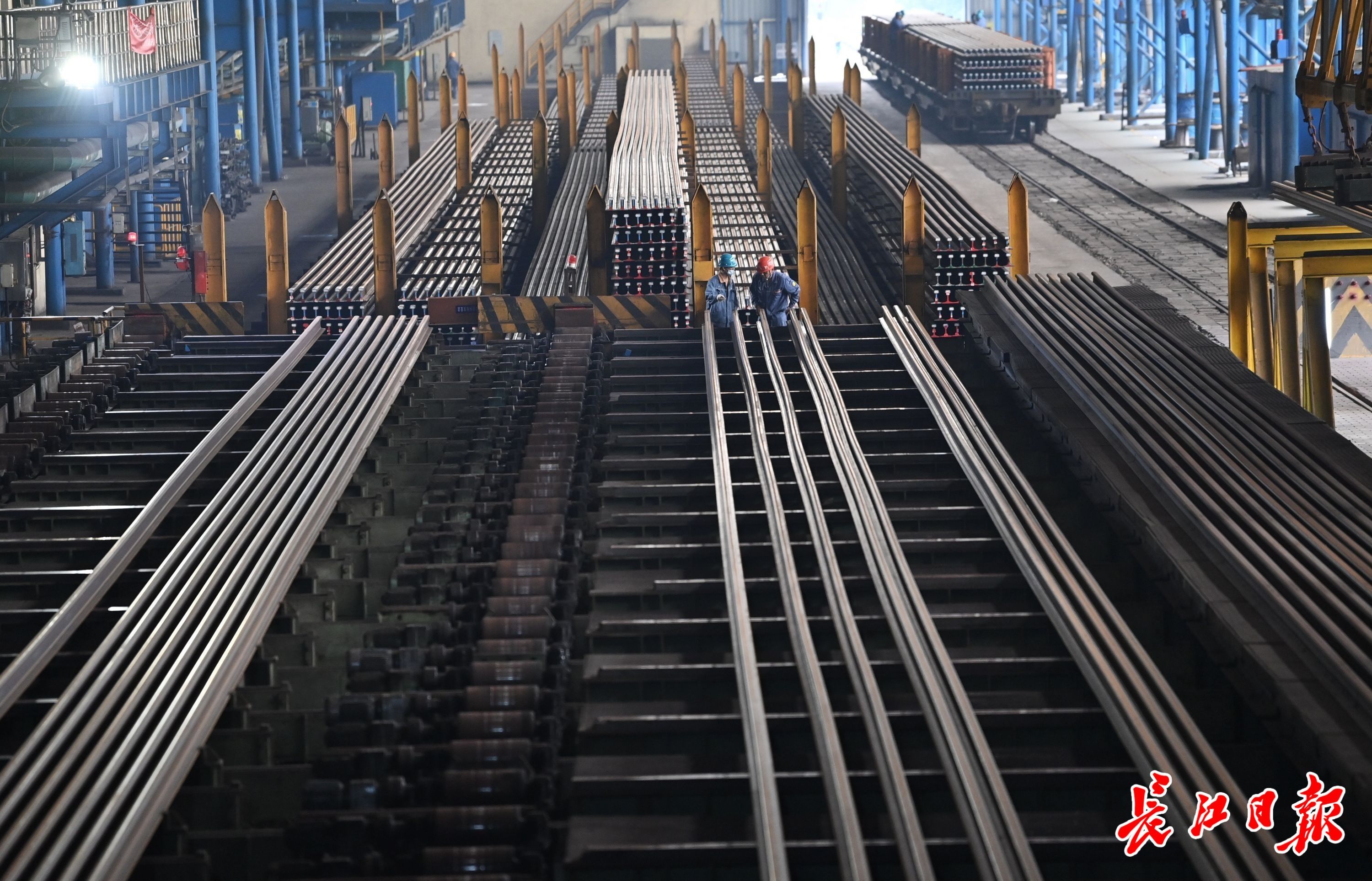 武钢百米重轨生产线忙碌而有序,该产品如今占据全国超三分之一市场份额。长江日报记者郭良朔 摄