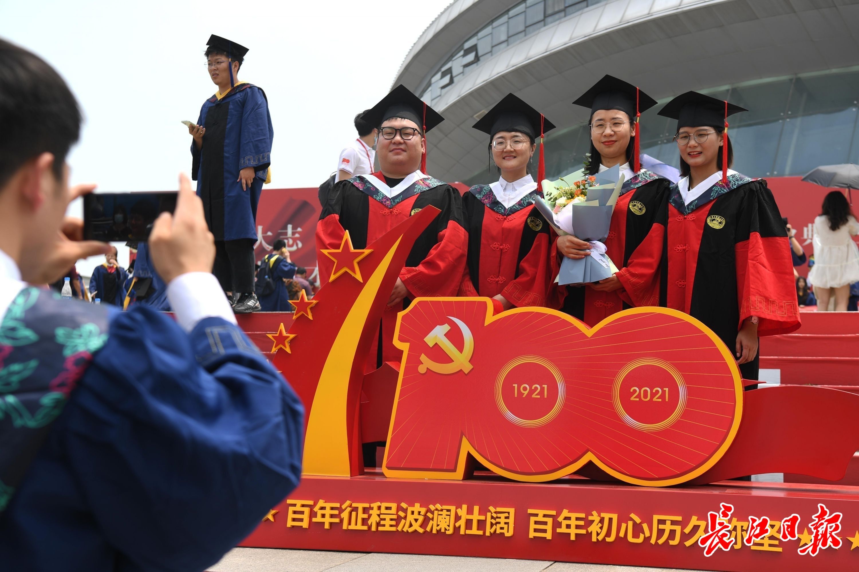 2021年6月22日,华中科技大学举行毕业典礼。图为身着博士服的毕业生拍照留念。长江日报记者高勇 摄
