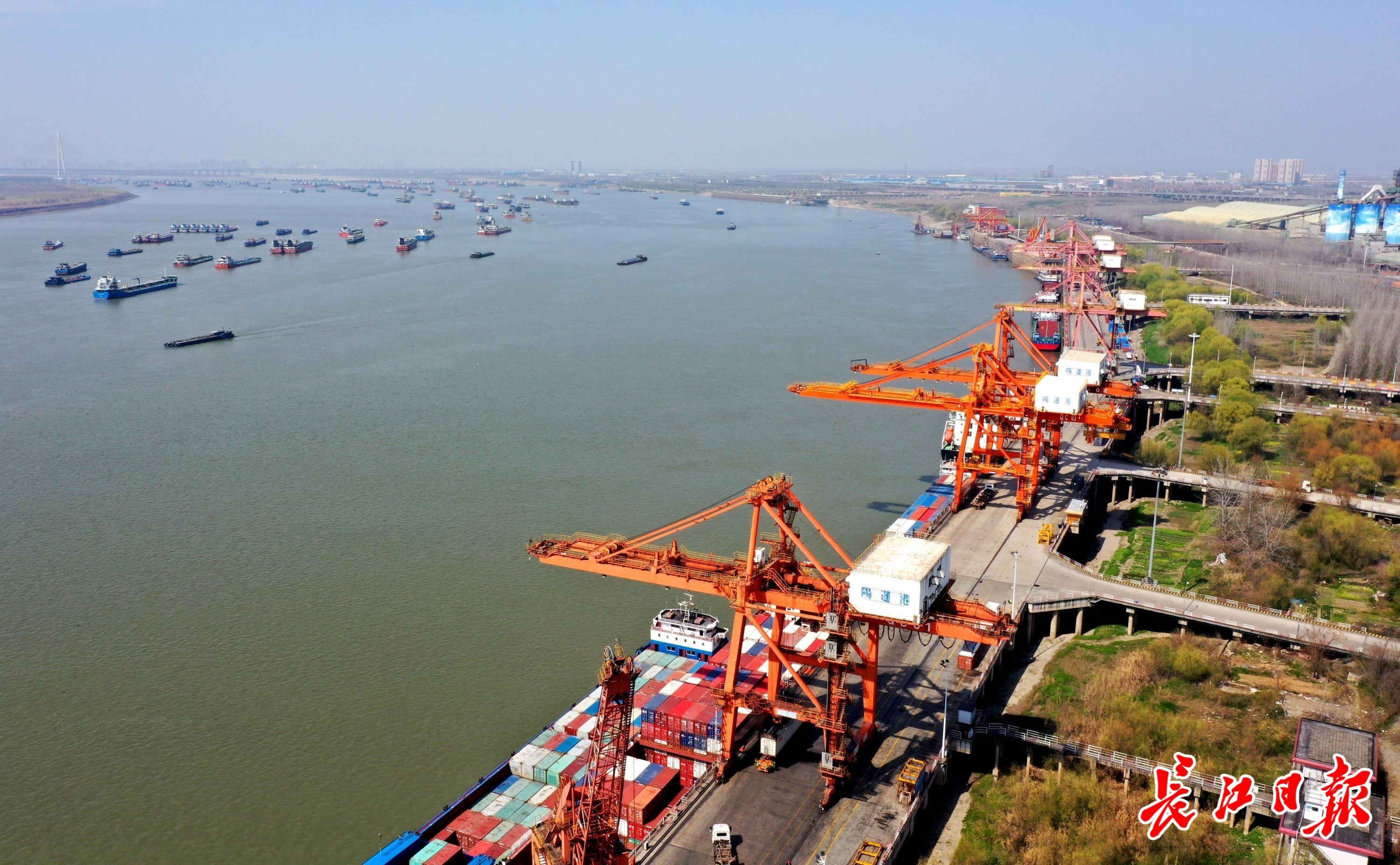 阳逻港一期码头一片繁忙,码头上货、卸货,龙门吊、卡车司机配合精准到位,车辆出入有序。长江日报记者刘斌 摄