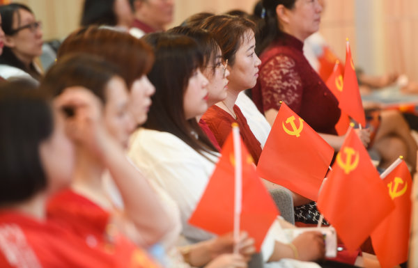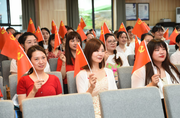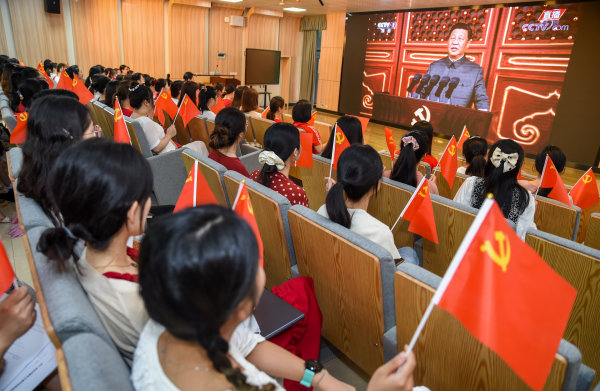 清晨7时30分,老师们身着红色或白色正装,拿着鲜艳的党旗,齐聚学校报告厅,收看现场直播。当国旗在天安门广场冉冉升起,老师们肃立,齐唱国歌。“这一刻,我们热血沸腾,作为一名中国人,作为一名人民教师,此时此刻,我感到无上光荣。”该校教师马琪琪说。