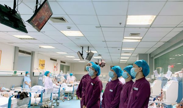 武汉大学人民医院医护患共同收看庆祝中国共产党成立100周年大会直播。医院供图