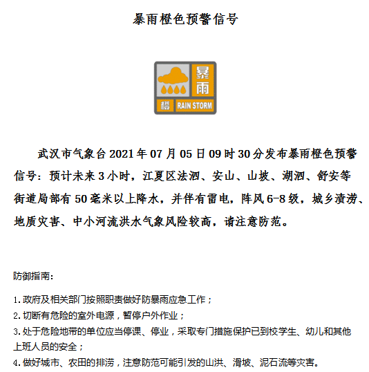 武汉市气象台今天早间9时30分发布暴雨橙色预警信号:预计未来3小时,江夏区法泗、安山、山坡、湖泗、舒安等街道局部有50毫米以上降水,并伴有雷电,阵风6-8级,城乡渍涝、地质灾害、中小河流洪水气象风险较高,请注意防范。