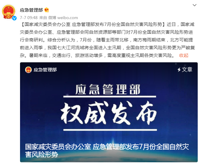 近日,国家减灾委员会办公室、应急管理部会同自然资源部、水利部、农业农村部、中国气象局、国家林草局等部门对7月份全国自然灾害风险形势进行会商研判。综合分析认为,7月份,随着主雨带北移,南方梅雨期结束,北方可能提前进入雨季,我国七大江河流域将全面进入主汛期,全国自然灾害风险形势更为严峻复杂。暑期来临,交通出行、旅游活动增多,需高度重视主汛期各类灾害风险。