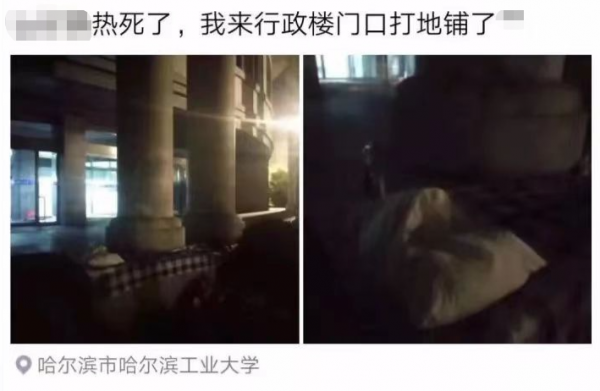 近日突发高温天气,哈尔滨工业大学学生在寝室热得无法入睡,在行政楼门前打地铺。