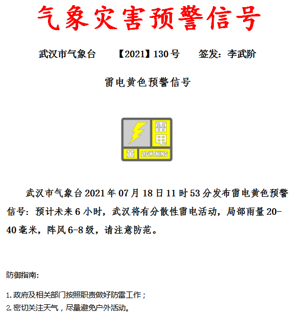 今天午后这场阵雨期间,雷声阵阵,十分明显。根据市气象台中午11时53分发布雷电黄色预警信号:预计未来6小时,武汉将有分散性雷电活动,局部雨量20~40毫米,阵风6~8级,请注意防范。这与午后那场暴雨后的快速升温也有关系,空气之中发生强对流运动,雷声就更加明显。