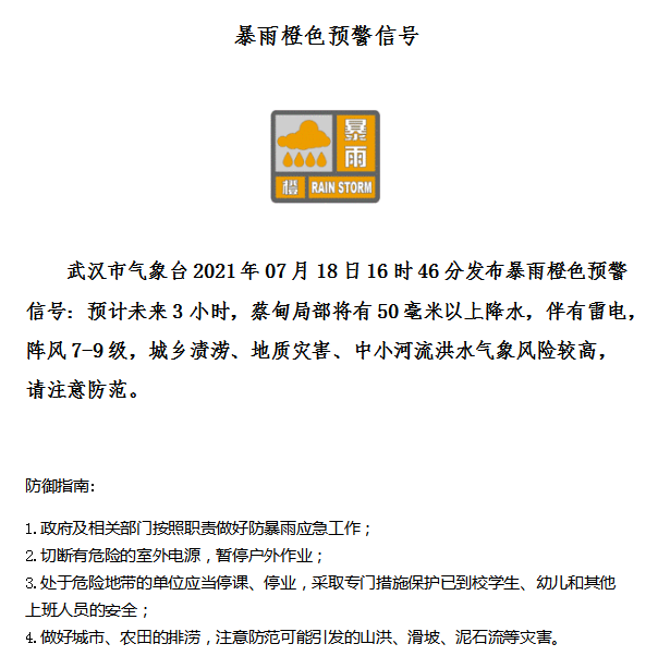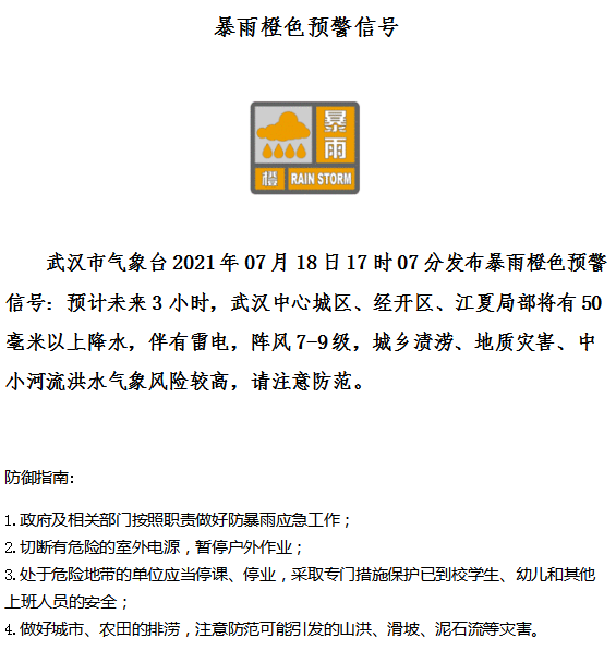 16时46分、17时7分,市气象台连续发布两次暴雨橙色预警信号:预计未来3小时,蔡甸局部将有50毫米以上降水,伴有雷电,阵风7-9级,城乡渍涝、地质灾害、中小河流洪水气象风险较高;未来3小时,武汉中心城区、经开区、江夏局部将有50毫米以上降水,伴有雷电,阵风7-9级,城乡渍涝、地质灾害、中小河流洪水气象风险较高,请注意防范。其中,中心城区主要是江汉、江岸、硚口、汉阳、武昌西部、洪山西部雨势较强,这也意味着,强降雨天气还将持续到晚间,出门要注意防范。