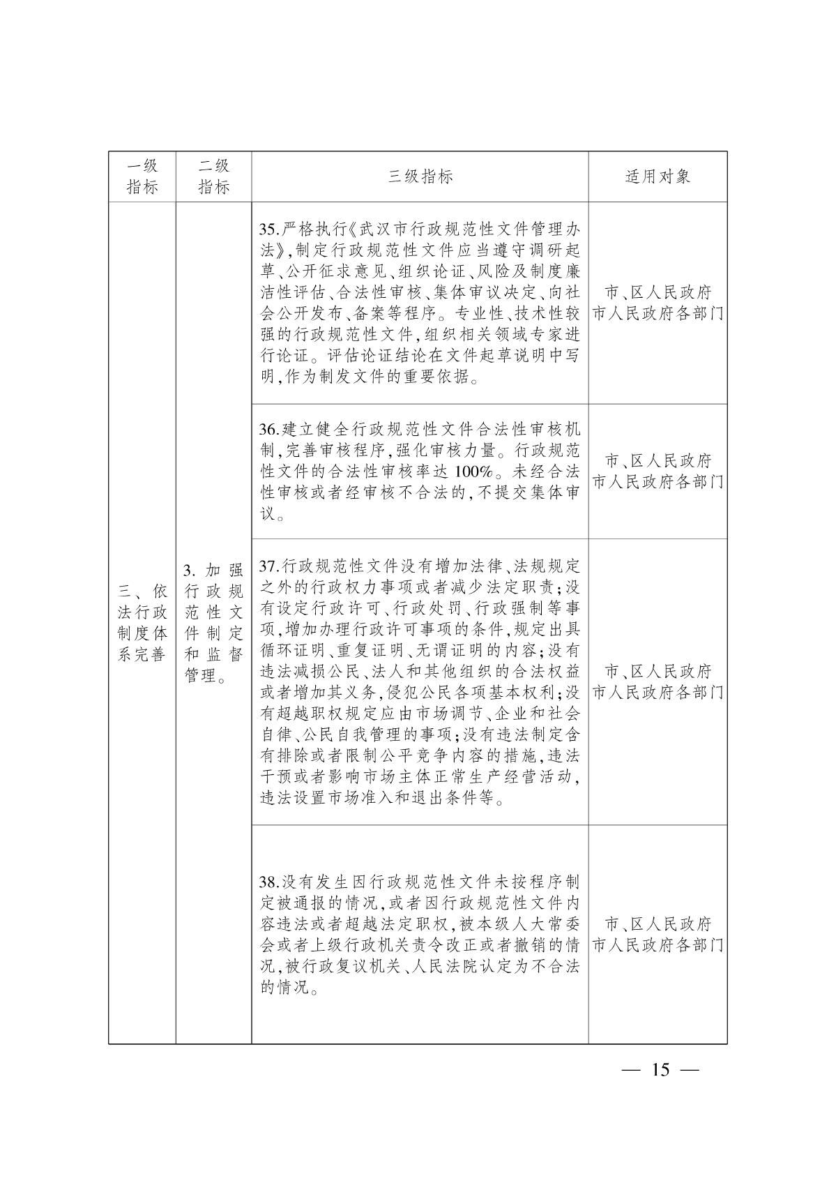 (五)促进严格规范公正文明执法,提升行政执法能力和公信力。深化行政执法体制改革,落实综合执法改革要求,继续探索实行跨领域跨部门综合执法。全面推进武汉市行政执法管理与监督云平台建设和应用,改进和创新执法方式,规范执法自由裁量权,健全行政执法和刑事司法衔接机制。全面推行涉企行政处罚“三张清单”,实施包容审慎执法。全面推行行政执法公示制度、执法全过程记录制度、重大执法决定法制审核制度,加大重点领域执法力度。严格落实行政执法责任制和责任追究制,加强行政执法监督。