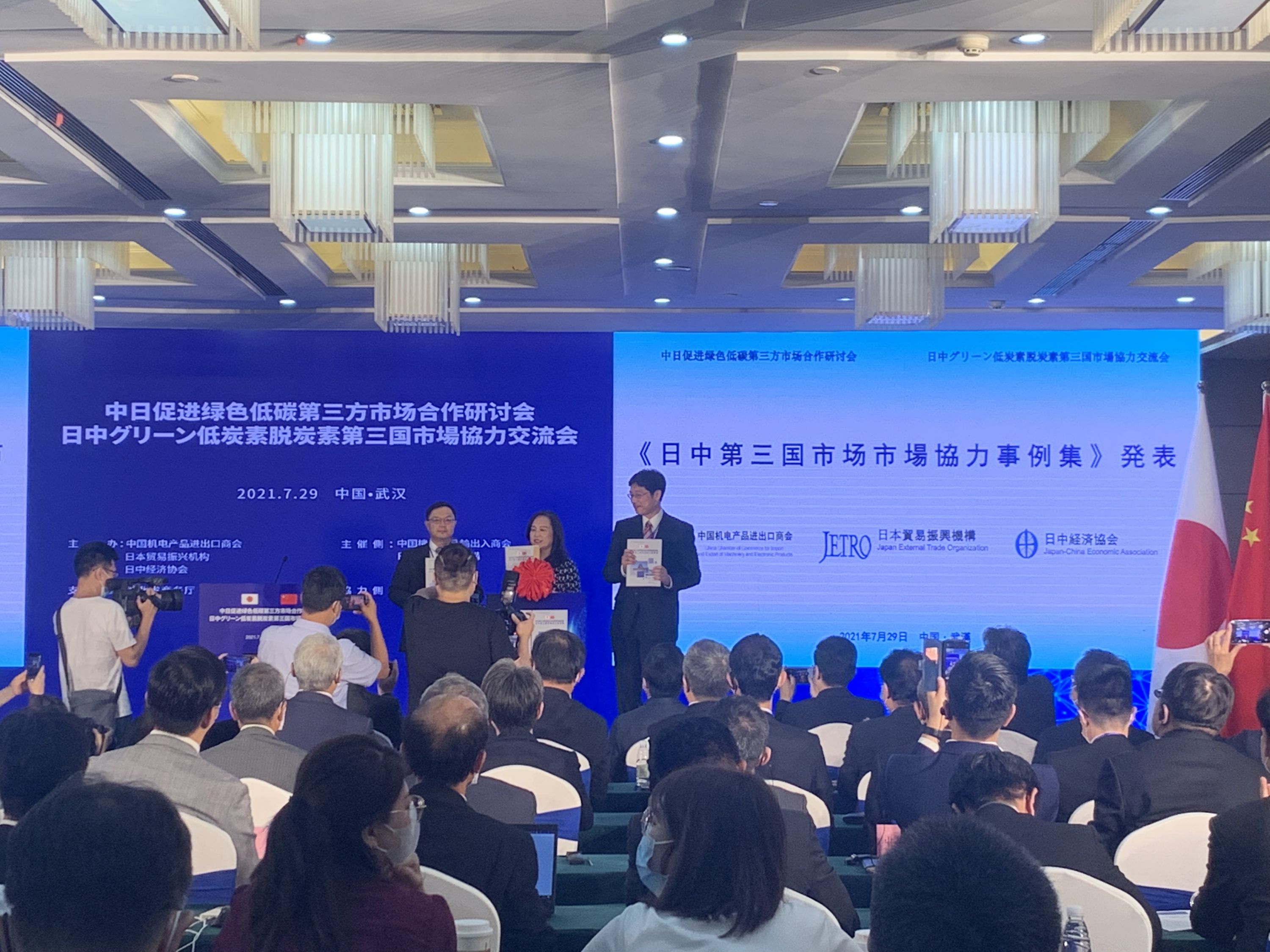 长江日报7月29日讯 7月29日,中日促进绿色低碳第三方市场合作研讨会在汉举办,中日两国政府、经济团体、企业代表250余人通过线上线下方式与会。