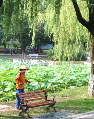 堤角公园对坐凳等公共设施每天进行两次消杀。长江日记者周超 通讯员周德飞 摄