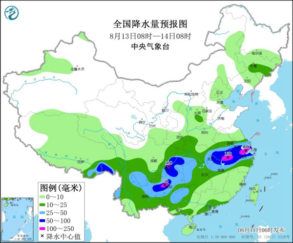 8月13日08时至14日08时,江淮中南部、江汉、江南中北部和西部、西南地区东部和南部、华南南部和西部、西藏东部等地部分地区有大到暴雨,局地有大暴雨。