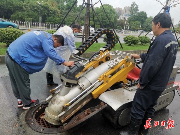 13日,东西湖区马池路,三名市政人员正在检查“龙吸水”排水设备。长江日报记者金振强 摄