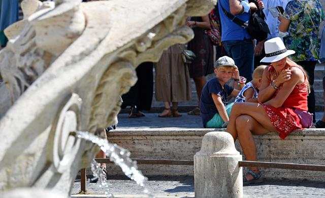 8月12日,游客坐在意大利罗马西班牙广场的喷泉旁。意大利近日遭遇高温天气,多地发布高温警报。(新华社记者 金马梦妮 摄)