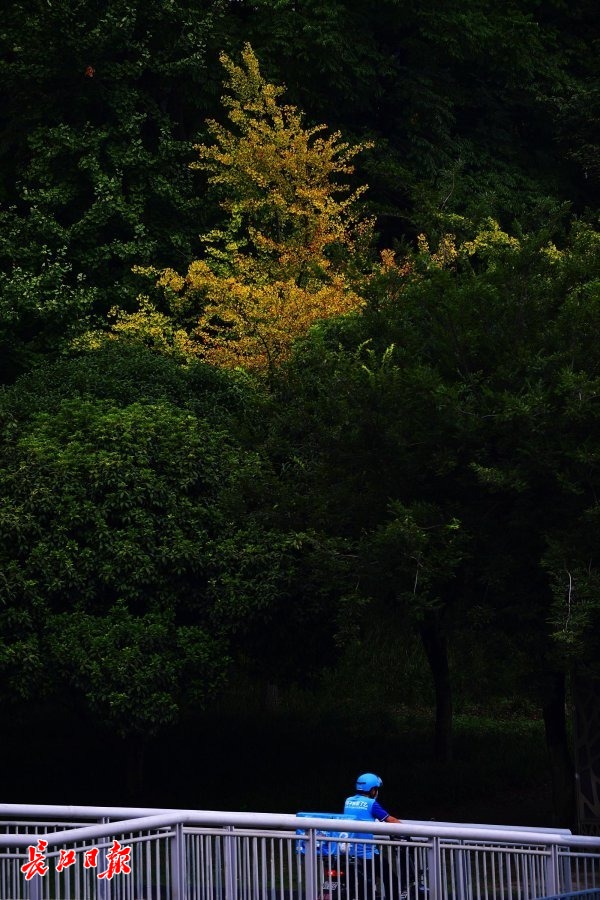 常青路旁的树林里,一棵已经变黄的银杏树格外醒目。 长江日报记者李永刚 摄