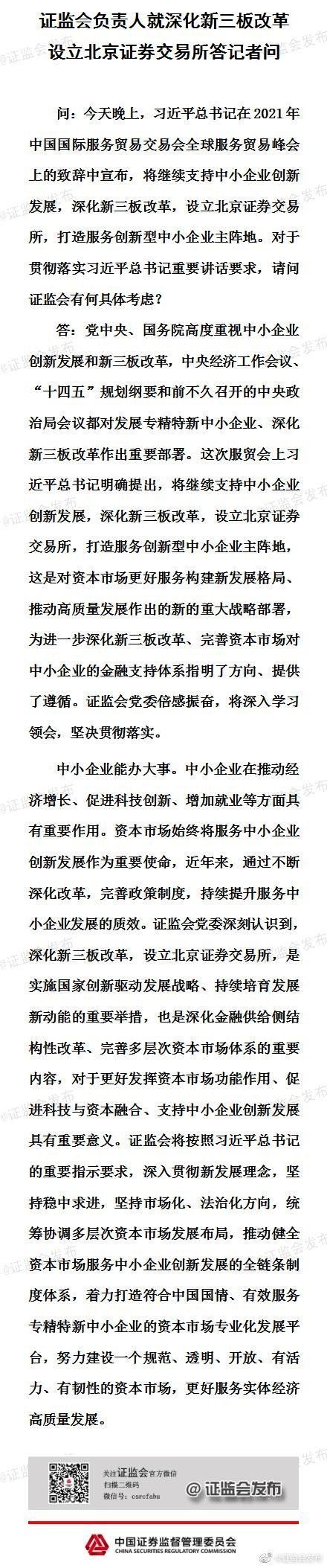 证监会负责人就深化新三板改革设立北京证券交易所答记者问