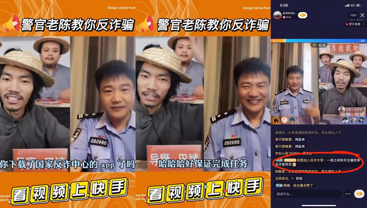 “当直播PK遇到警察”“快手主播化身反诈宣传员”“警察为了反诈骗有多努力”等多话题迅速火爆全网,为“全民反诈”的热度再添新柴。
