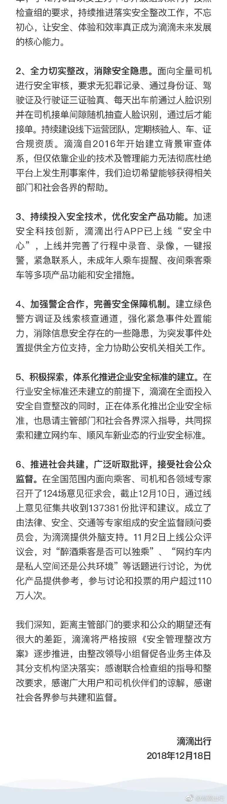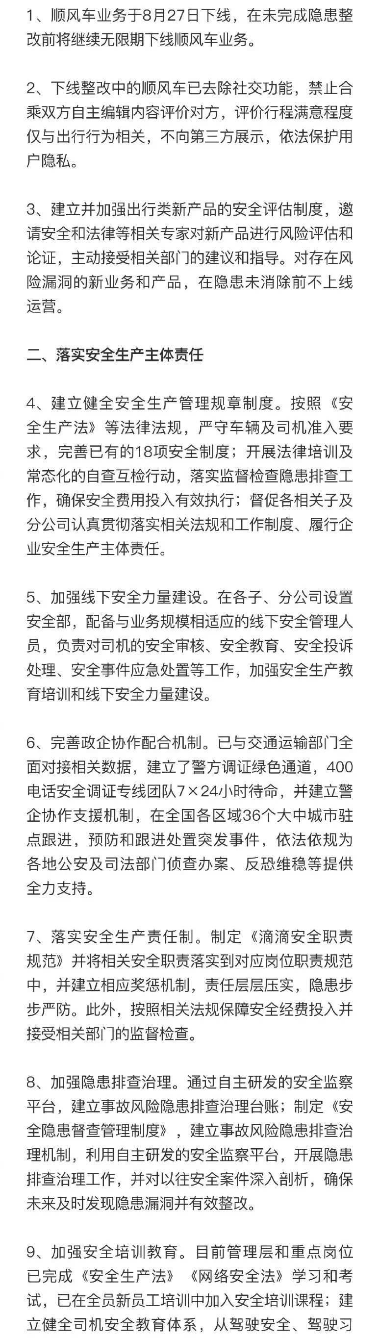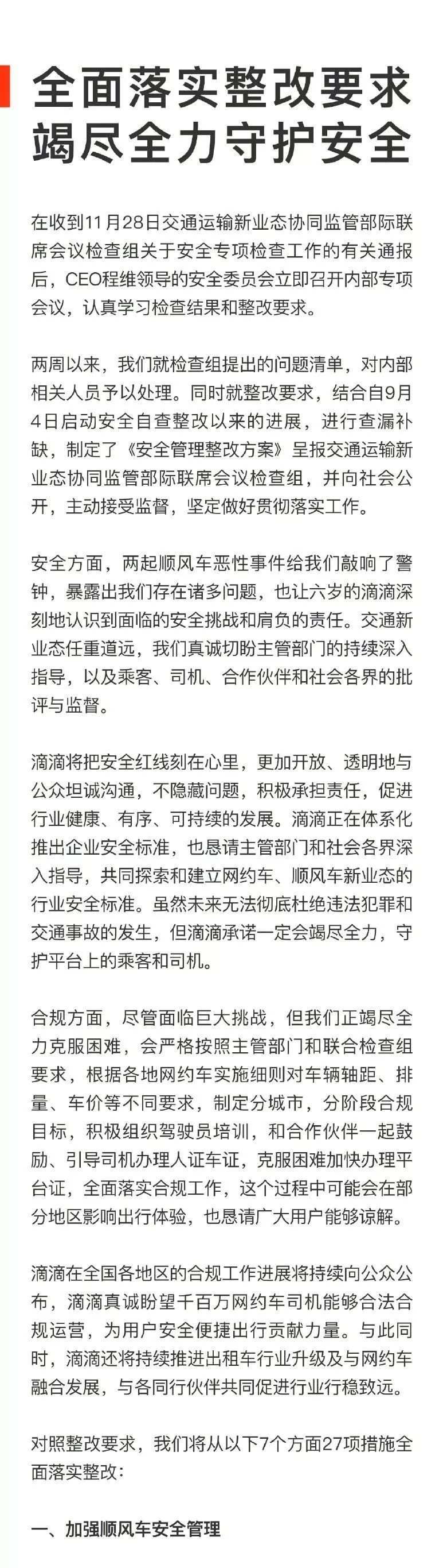 “顺风车”来不了了丨滴滴发布27项整改措施,业务继续无限期下线 2018-12-19 07:29 哈尔滨新闻网 0 据@滴滴出行官方微博,12月18日滴滴对外发布了安全管理整改方案,提出了7个方面27项具体整改措施。 来源:滴滴出行 【编辑:金鑫】