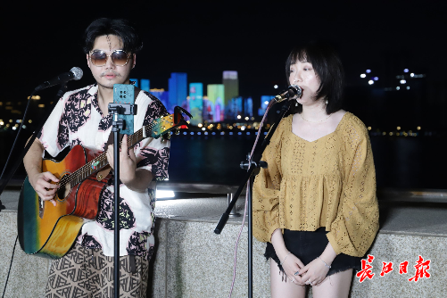 曾参加过长江日报“可视电台”的向晓童此次带着朋友洛克一起来到现场。他们边弹边唱《写给黄淮》《风吹麦浪》。向晓童说:“今天我们遛个弯就过来了,在直播节目中顺便给朋友洛克征婚。”直播接近尾声,网友说:“听不够,明晚不见不散。”
