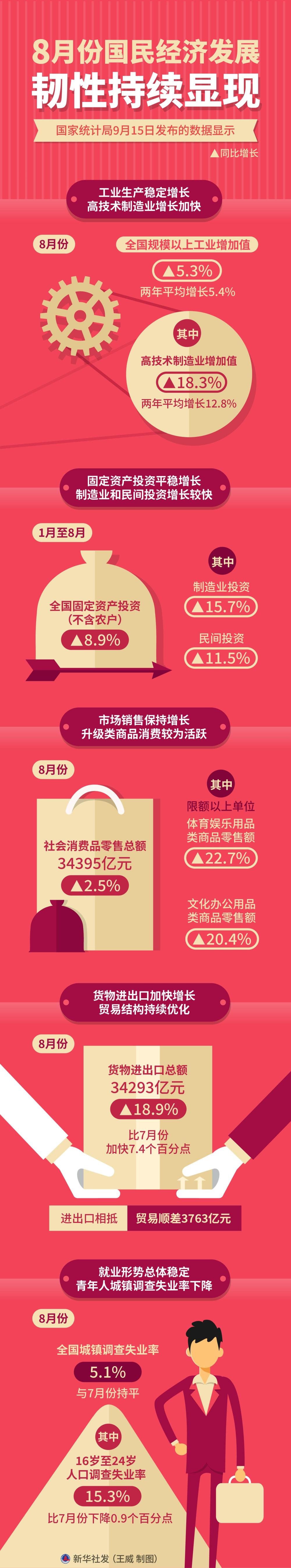 国家统计局9月15日发布的数据显示,8月份,国民经济继续保持恢复态势,转型升级持续推进,创新活力不断释放,就业物价总体稳定,质量效益稳步提高,主要宏观指标处于合理区间。