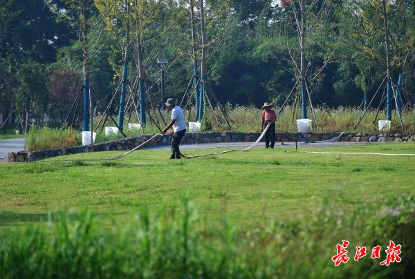 9月16日早晨,东西湖白马泾公园里工作人员为花草树木浇水。记者李永刚 摄