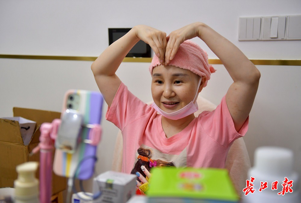 直播开始前,彭丽丽拿出一块头巾,在自己头上包了一个漂亮的样式,“以前我是光着头直播,后来有人投诉说我‘卖惨’,我试过假发、帽子,最后觉得还是头巾方便”。