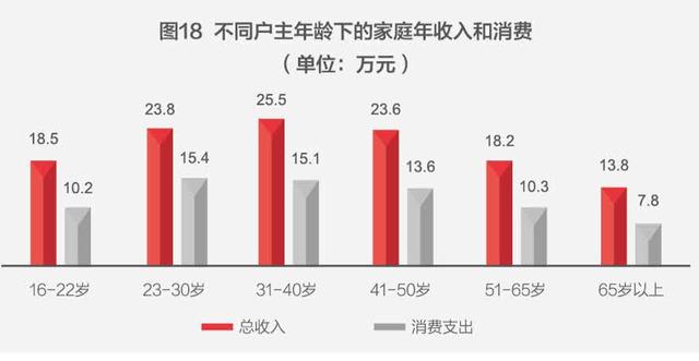 处于不同生命周期的家庭,其财富积累的差异性较大,年轻和年老家庭收入与中年家庭收入差异过大。报告显示,户主年龄在31-40岁时家庭平均年收入最高,达到25.5万元;其次是户主年龄在23-30岁的家庭,年收入为23.8万元。