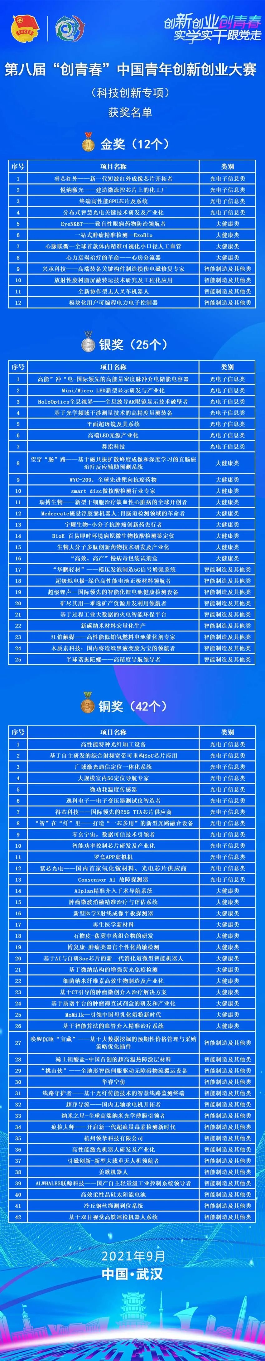长江日报大武汉客户端9月28日讯(记者唐婧妮 通讯员湖小青)9月27日,由共青团中央、人力资源和社会保障部、农业农村部、商务部、国家乡村振兴局、湖北省人民政府主办,中国青年创业就业基金会、中国青年企业家协会、中国农村青年致富带头人协会、中国青年创业联盟、共青团湖北省委、武汉东湖新技术开发区管委会共同承办的2021年中国青年创新创业交流营暨第八届“创青春”中国青年创新创业大赛(科技创新专项)在汉闭幕。