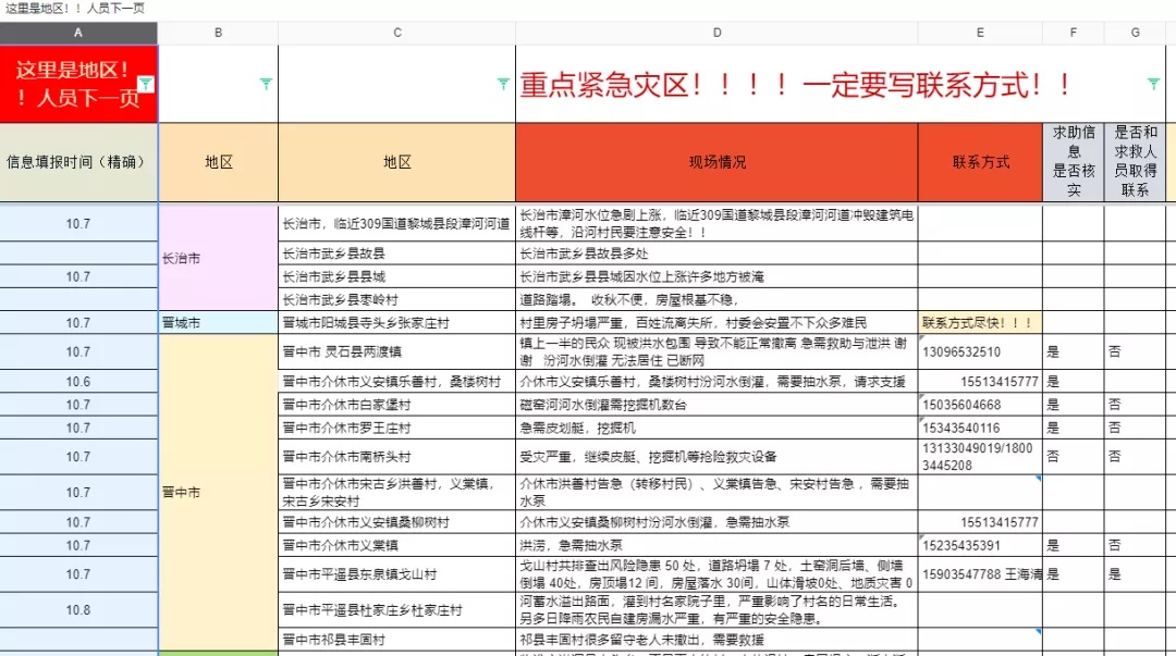 在外地读大三的祁同学关注到家乡的灾情,特地建立在线共享文档,统计求助、物资需求、救援联系方式等信息,方便救援工作的开展。
