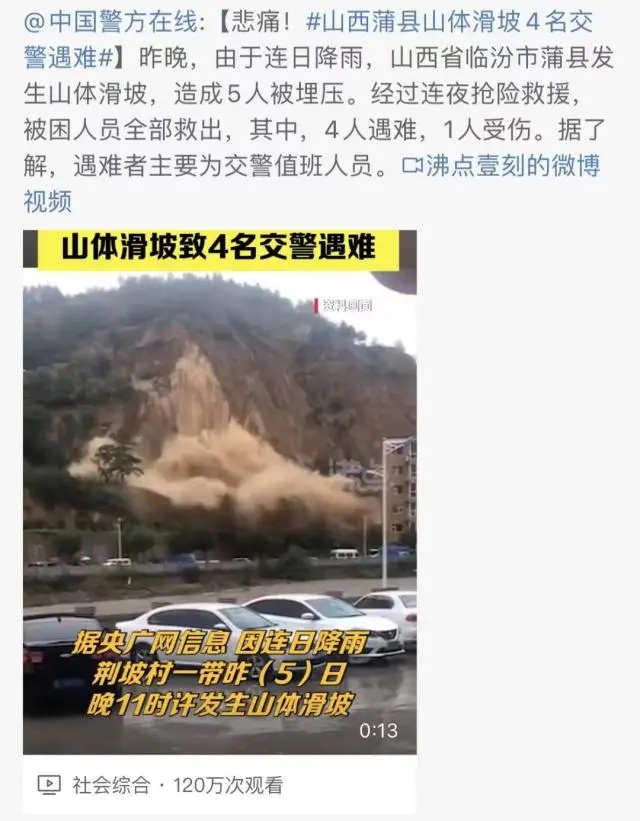 更让人揪心的是,蒲县一带多次发生了山体滑坡,已经造成4人遇难,1人受伤。据悉,那4名遇难者主要为当地的值班交警......