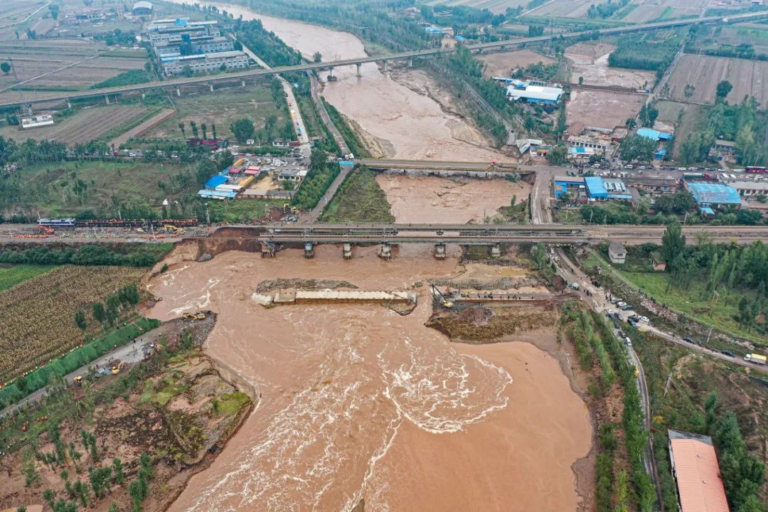 汾河下游河津段遭遇57年来(1964年以来)最大洪水,平日不足10米宽的汾河河面如今已超过百米。汾河流量由日常的每秒40立方米激增20多倍,达到每秒900立方米左右。