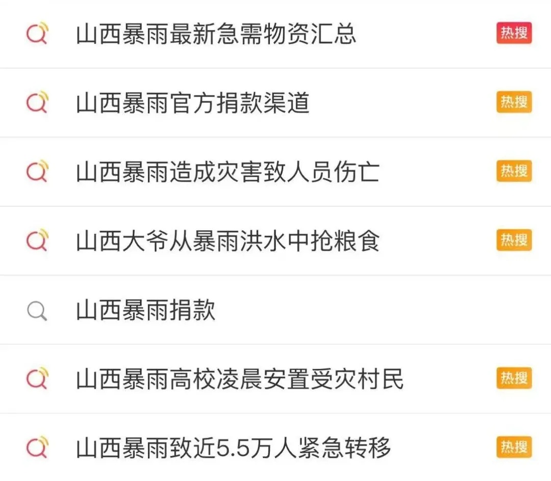 山西连日的暴雨牵动了全国人民的心,#山西加油#等多个相关话题登上社交媒体热搜榜。