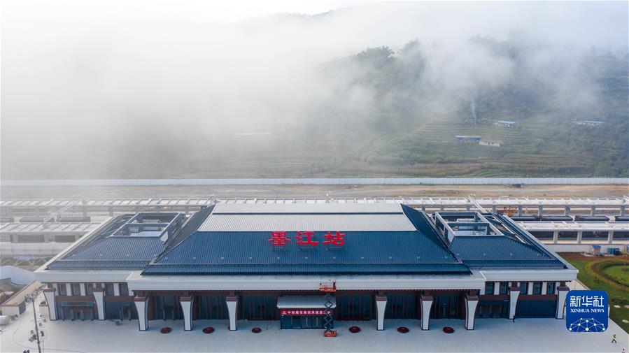 9月28日拍摄的中老铁路墨江站(无人机照片)。新华社记者 胡超 摄