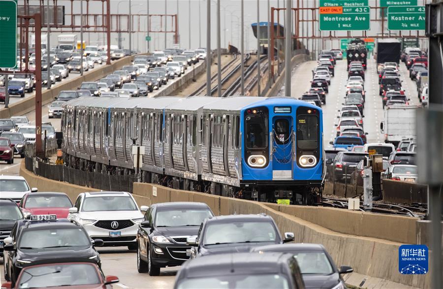 5月6日,在美国芝加哥,一列挂有7000系列车厢的地铁列车载客试运行。中国中车青岛四方机车车辆股份有限公司(中车四方)在美国制造组装的7000系列地铁车厢4月21日在芝加哥开始载客试运行。新华社发(乔尔·莱纳 摄)