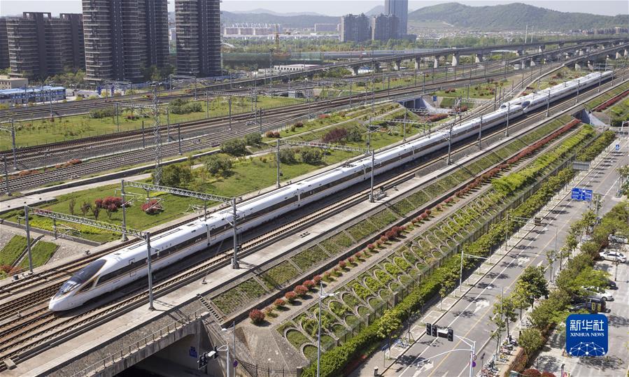 复兴号动车组列车行驶在京沪高铁南京市境内(2018年4月9日摄)。新华社发(苏阳 摄)