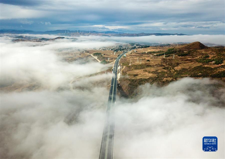 云雾中的贵州省六威高速公路观风海大桥(2018年12月19日摄,无人机照片)。新华社发(何欢 摄)