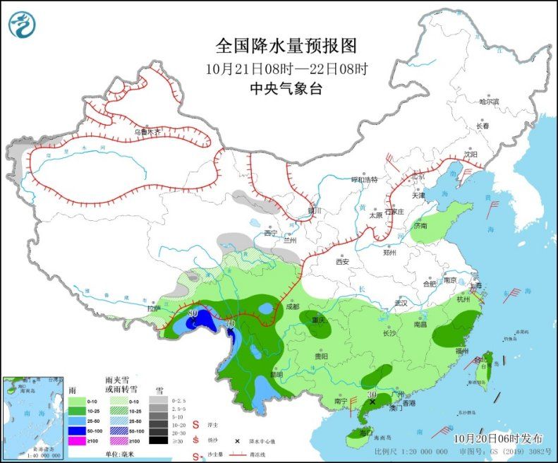 明天,新疆南疆西部山区、西藏东北部、青海东南部等地部分地区有小到中雪或雨夹雪。西藏东部、浙江南部、福建北部、川西高原南部、云南中西部等地部分地区有中到大雨,其中,西藏东南部、云南西北部局地有暴雨(50~80毫米)。