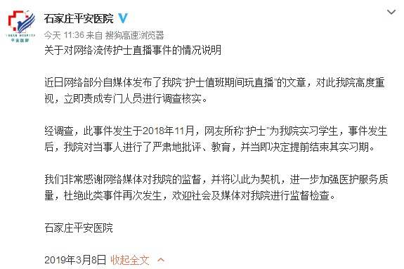 据微博@石家庄平安医院,9日,医院发布关于对网络流传护士直播事件的情况说明。以下为全文: